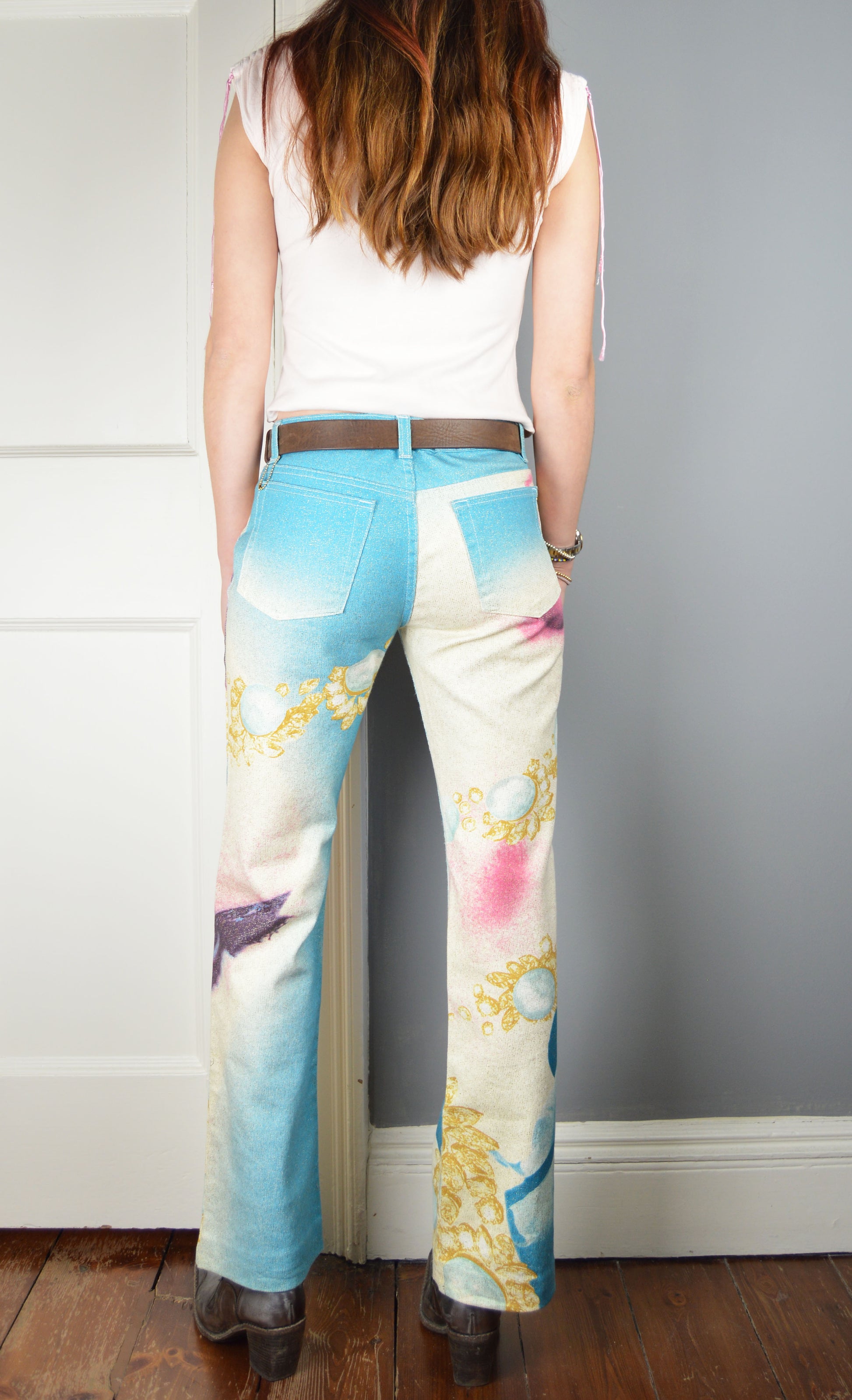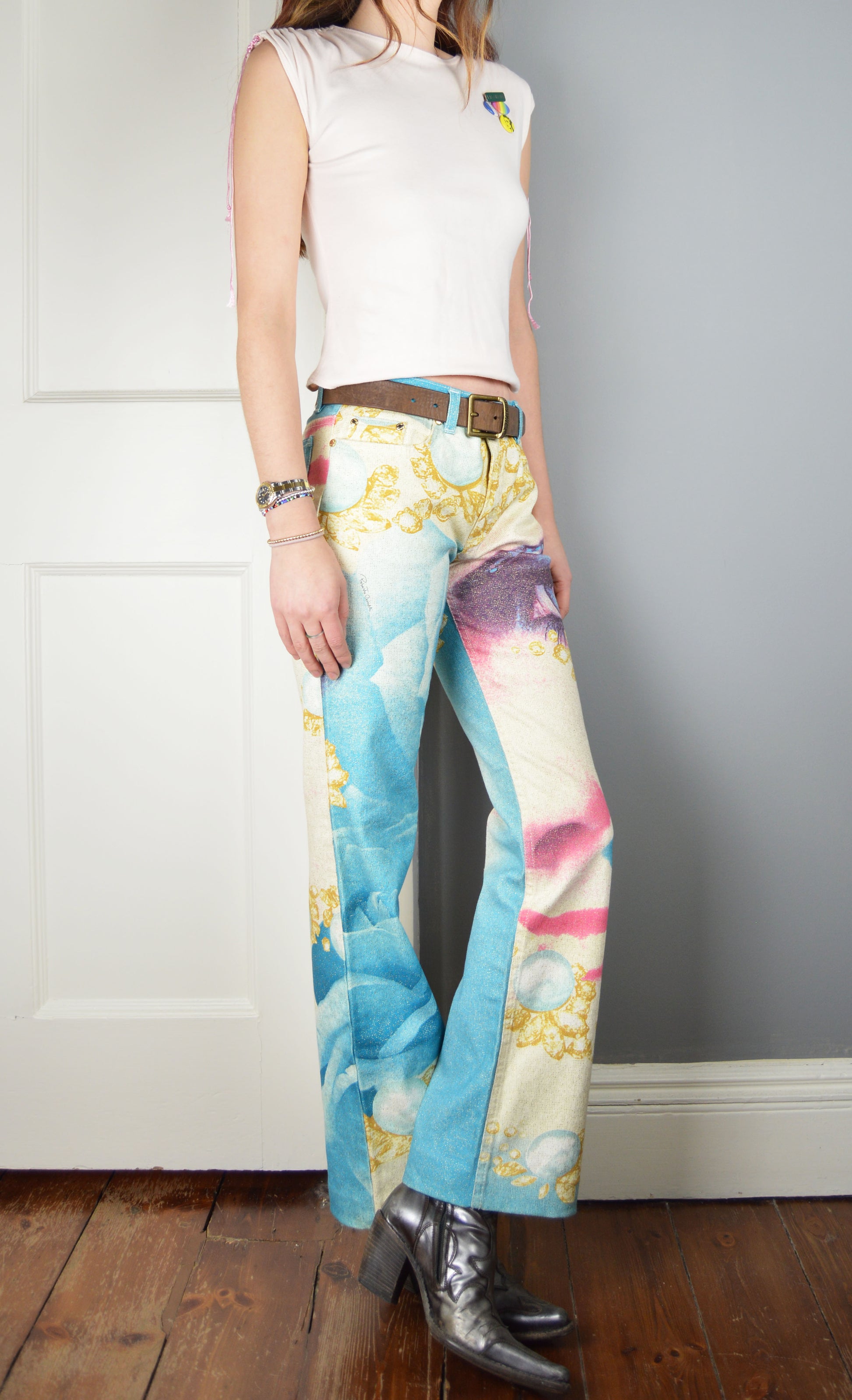 A glorious pair of vintage Roberto Cavalli jeans, the size on the label is a S although this depends on the desired fit (they have been pictured here on a size 6/8 UK, 5 7"). Please refer to the measurements below for more information. They are in great condition.