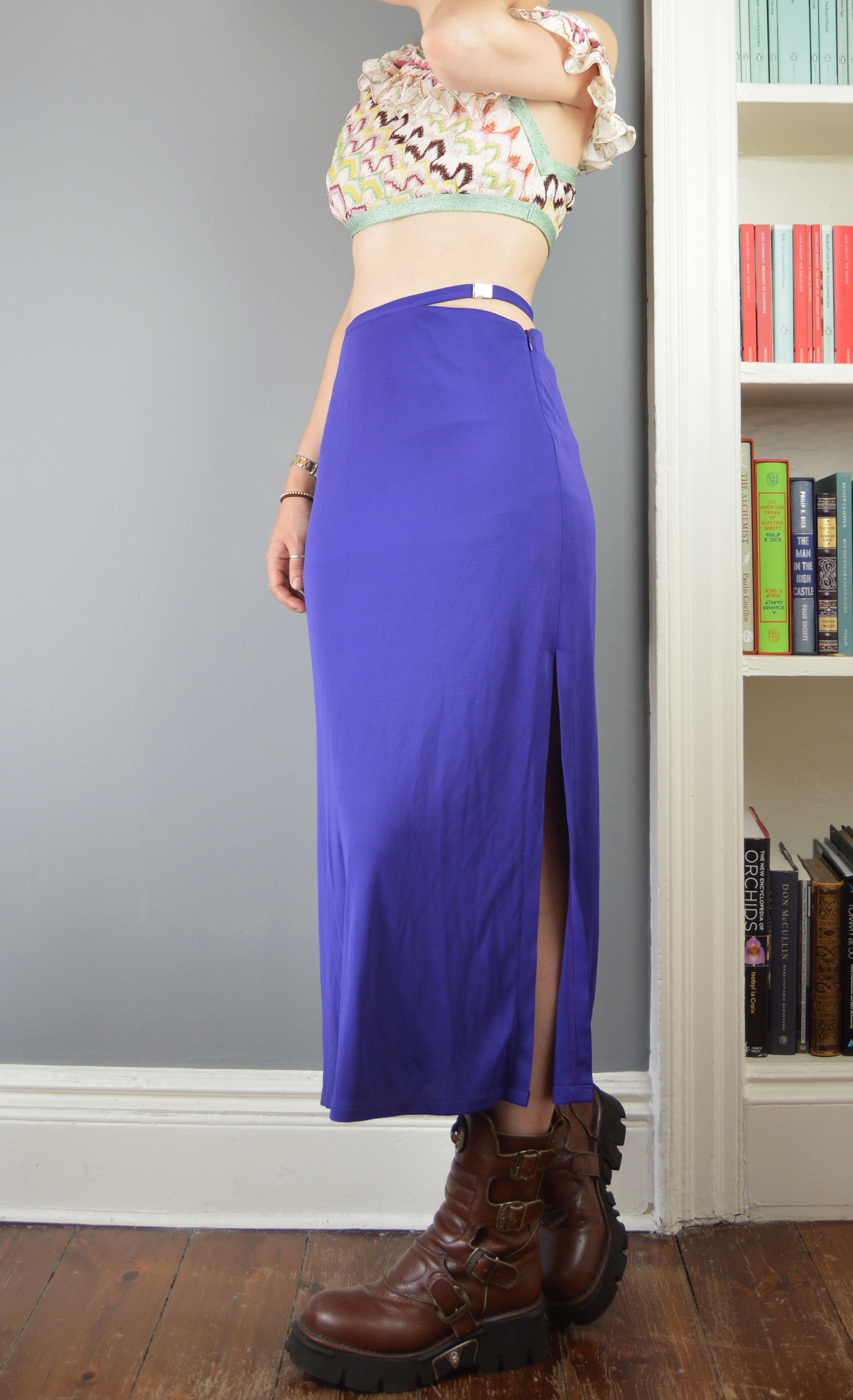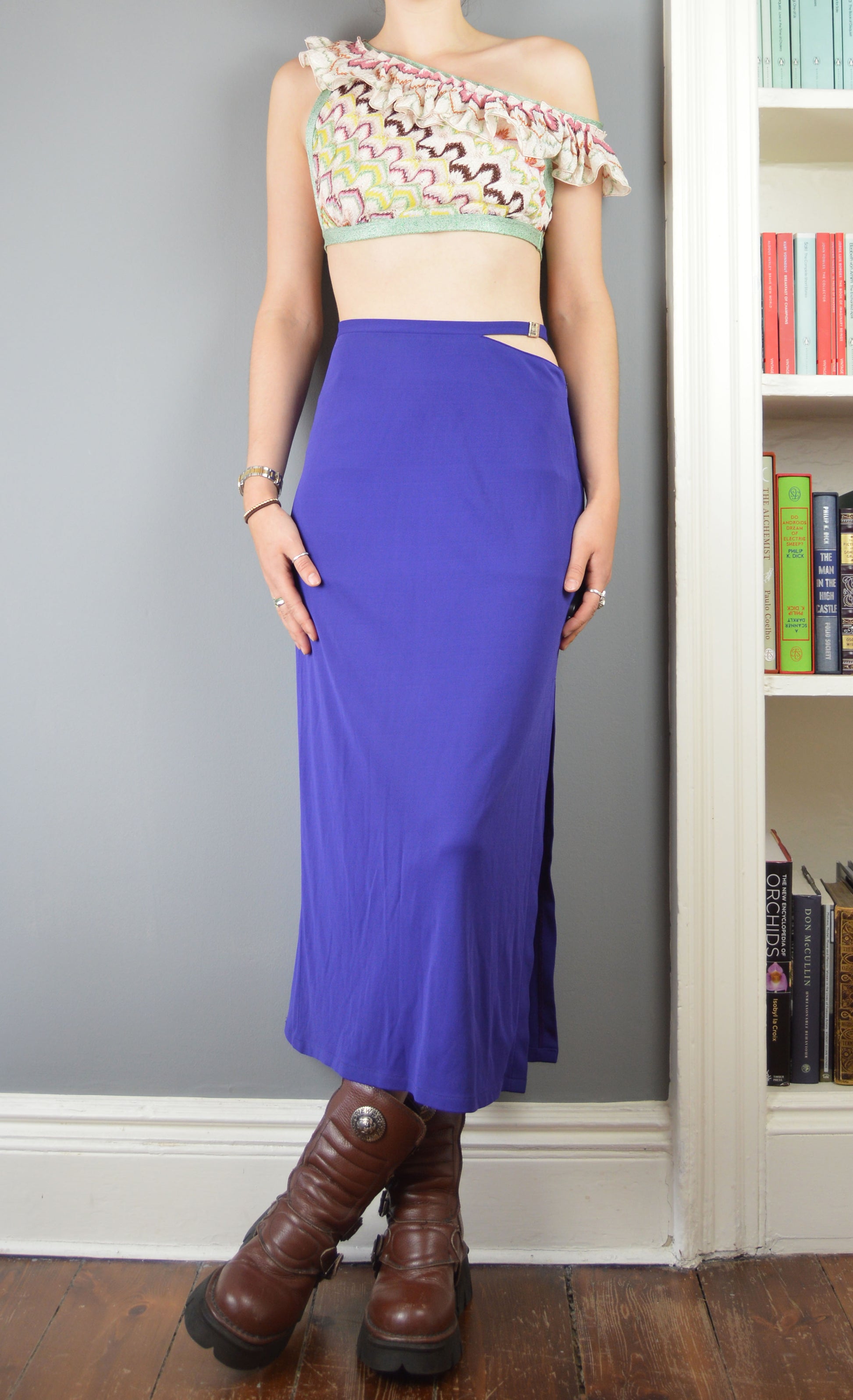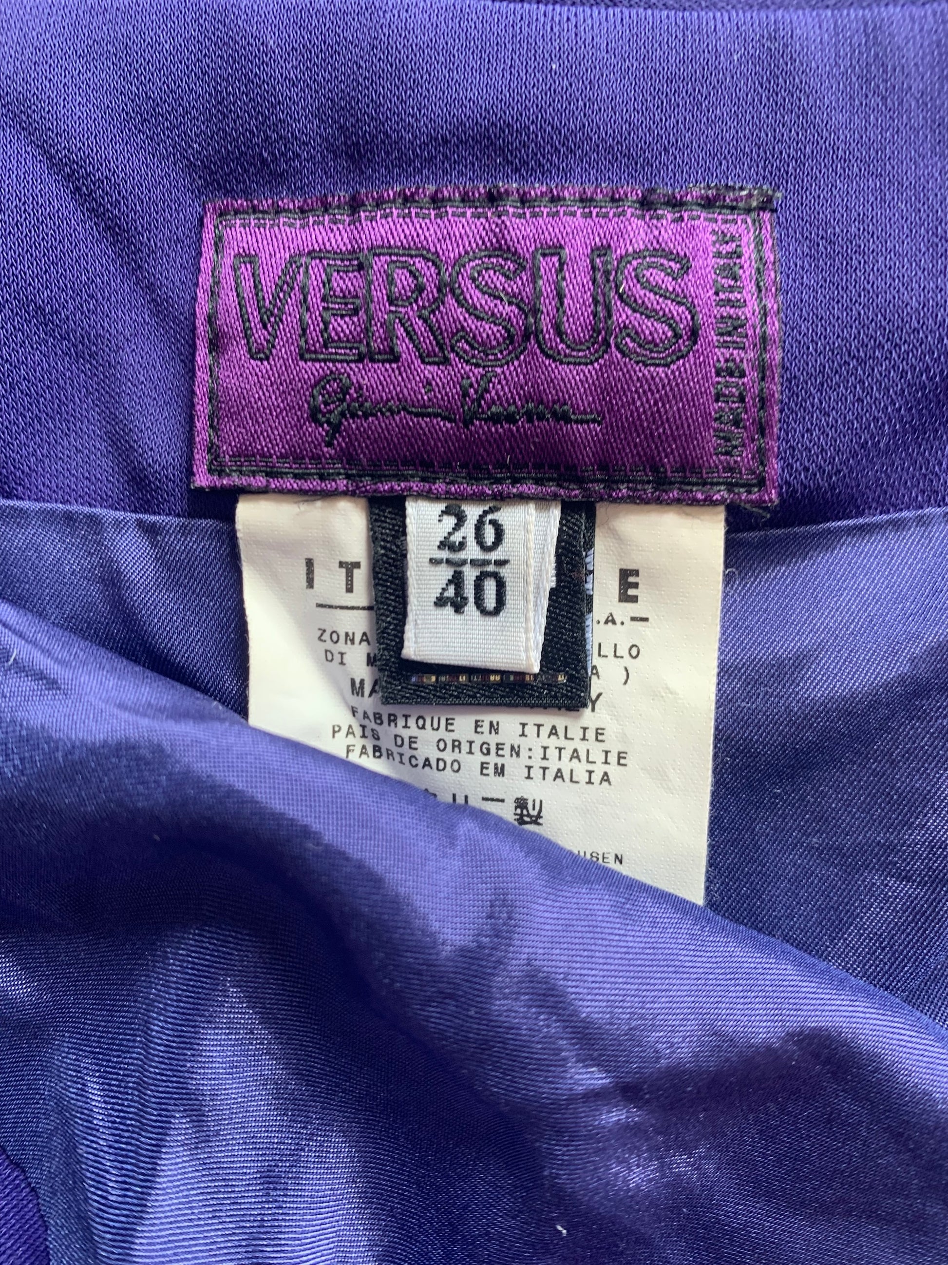 A fabulous vintage, purple skirt from the Versus Versace line. The size on the label is a 26/42 IT (8 UK) and it has been pictured here on a size 6/8 UK, 5 7". It has quite a snug fit so please refer to the measurements below for more information. There are no flaws to the piece apart from the buckle at the waist being a little difficult to fasten securely, but it does.