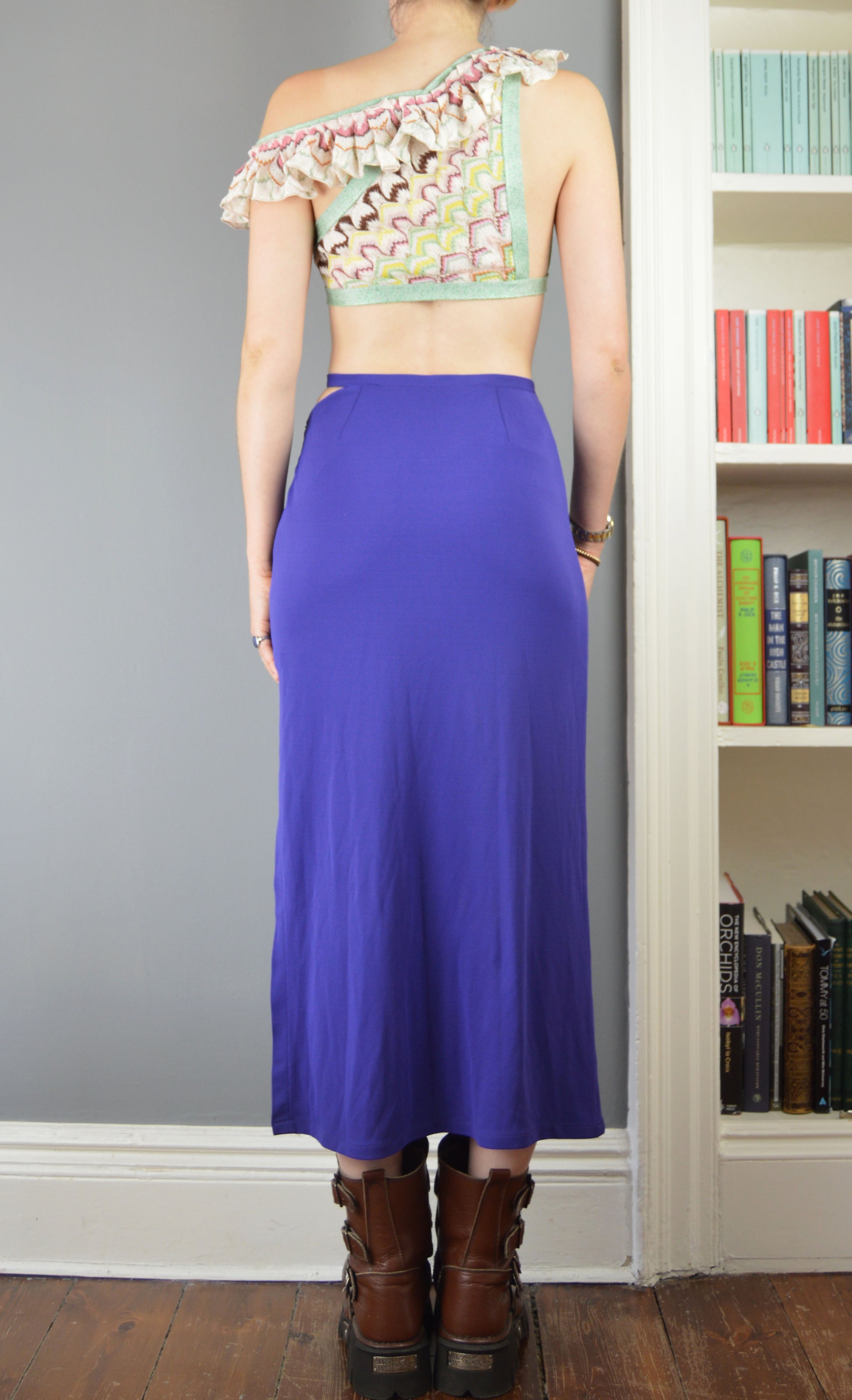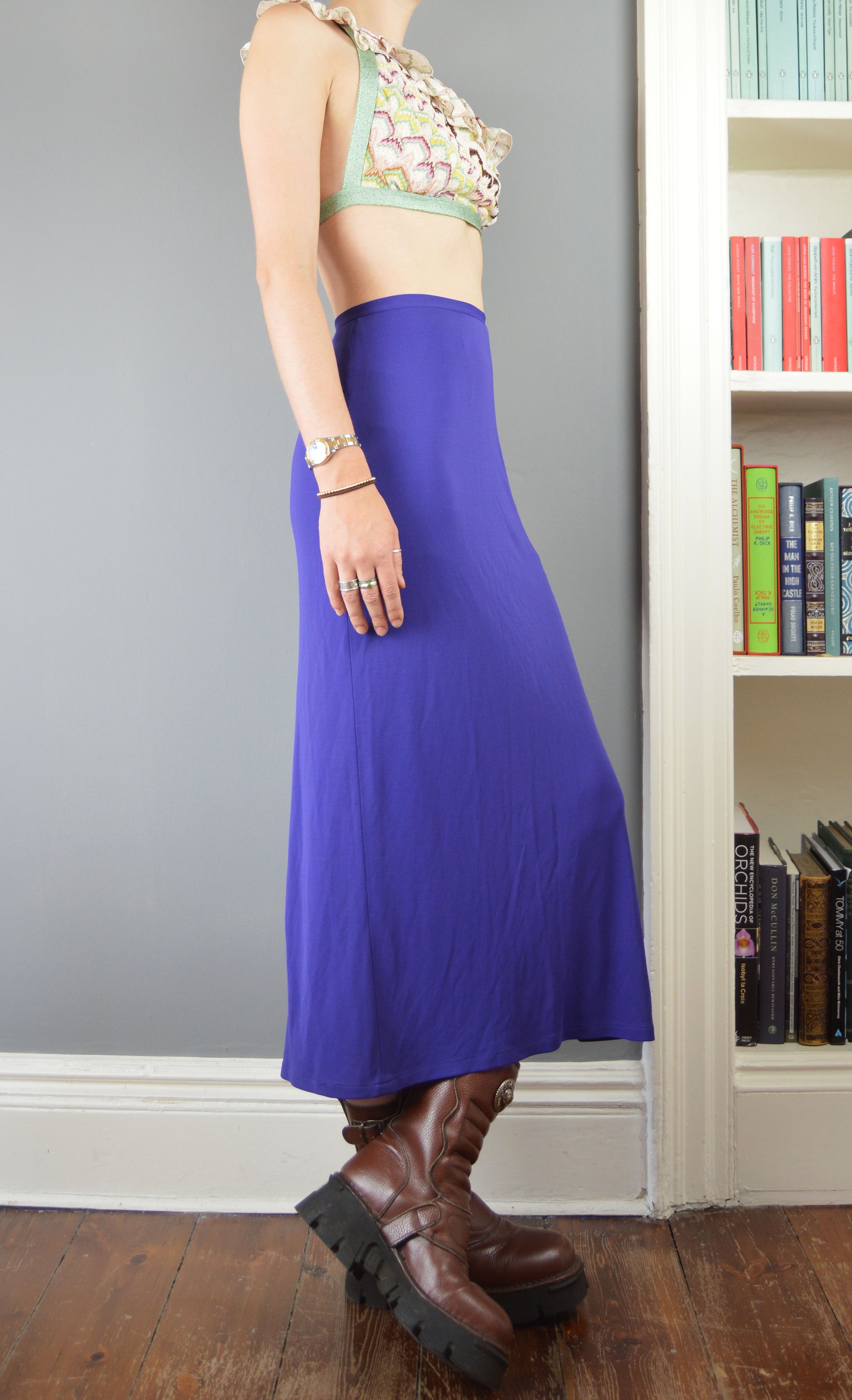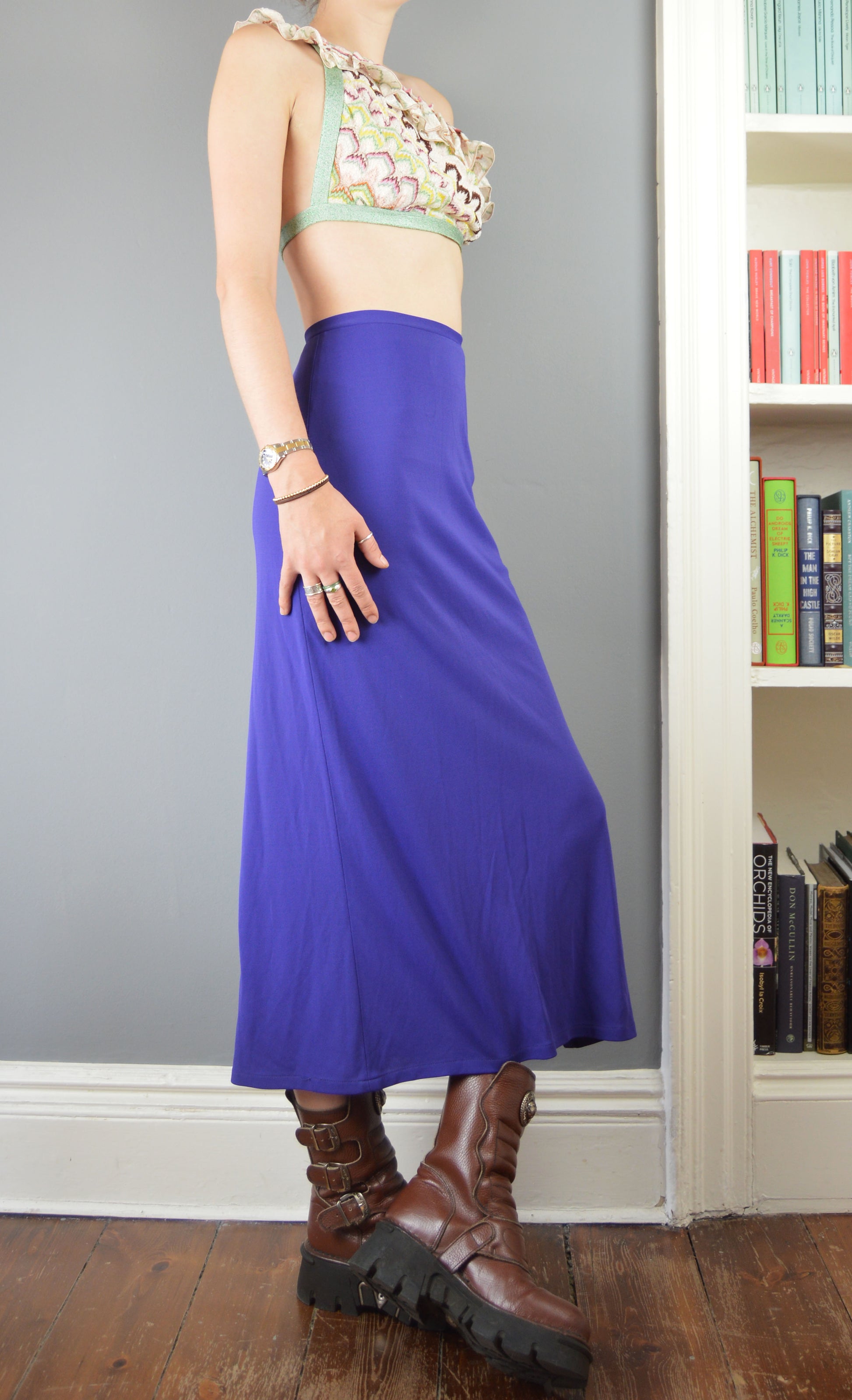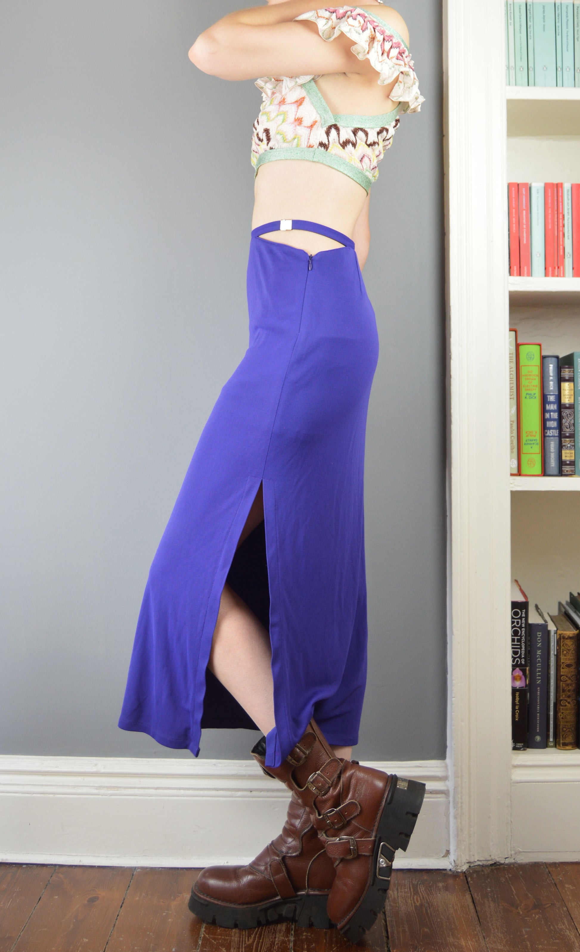 A fabulous vintage, purple skirt from the Versus Versace line. The size on the label is a 26/42 IT (8 UK) and it has been pictured here on a size 6/8 UK, 5 7". It has quite a snug fit so please refer to the measurements below for more information. There are no flaws to the piece apart from the buckle at the waist being a little difficult to fasten securely, but it does.