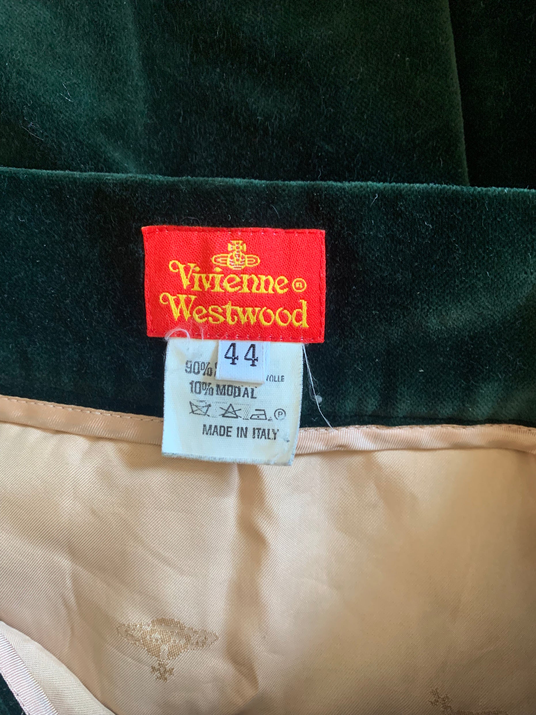 Amazing, vintage Vivienne Westwood velvet skirt. The size on the label is an IT 44, although it comes up smaller. It has been pictured here on a size 8 UK, 5 7". Please refer to the measurements below for more accuracy. The skirt is in great condition apart from some colour run on the lining, not affecting the outside look of piece at all.