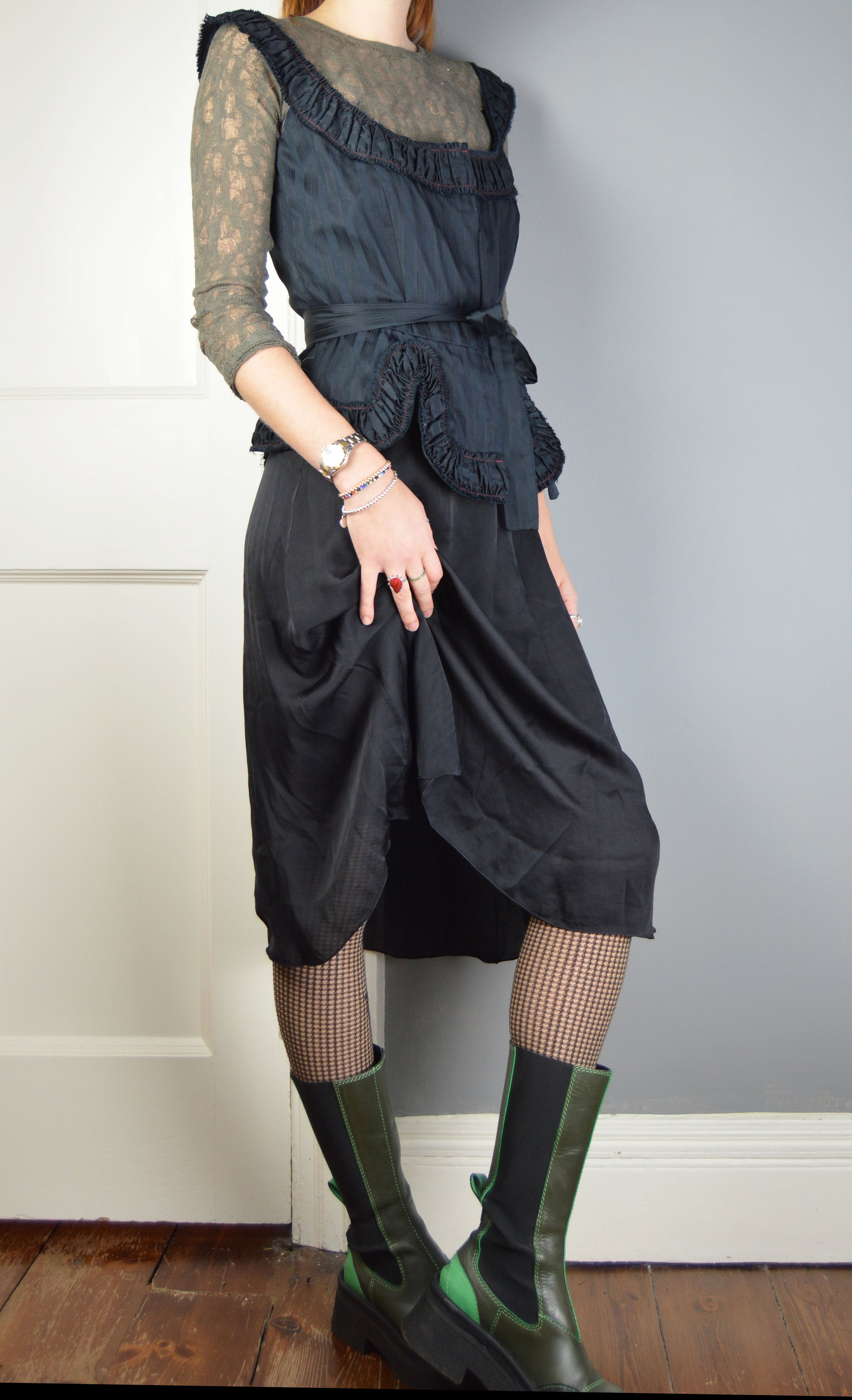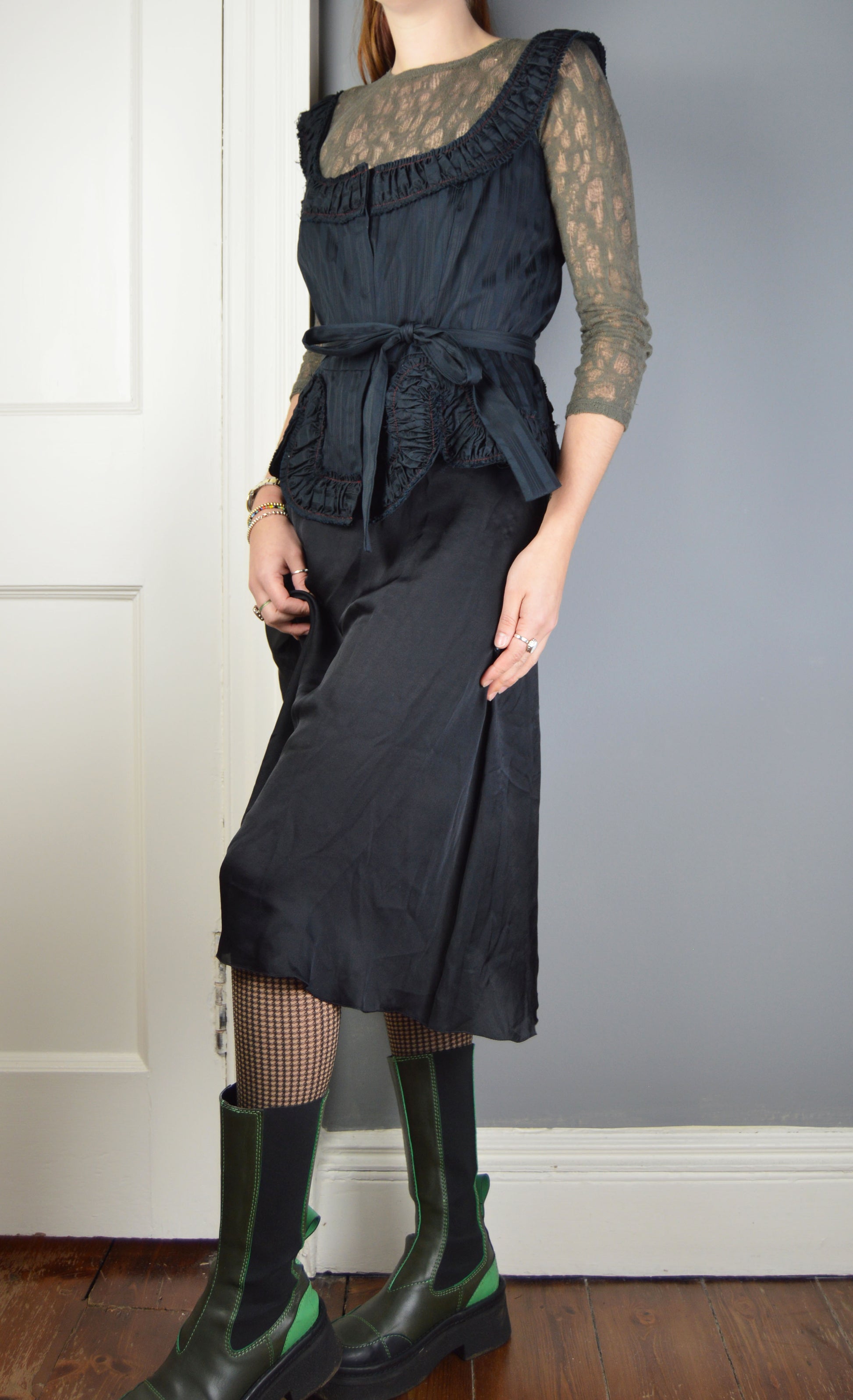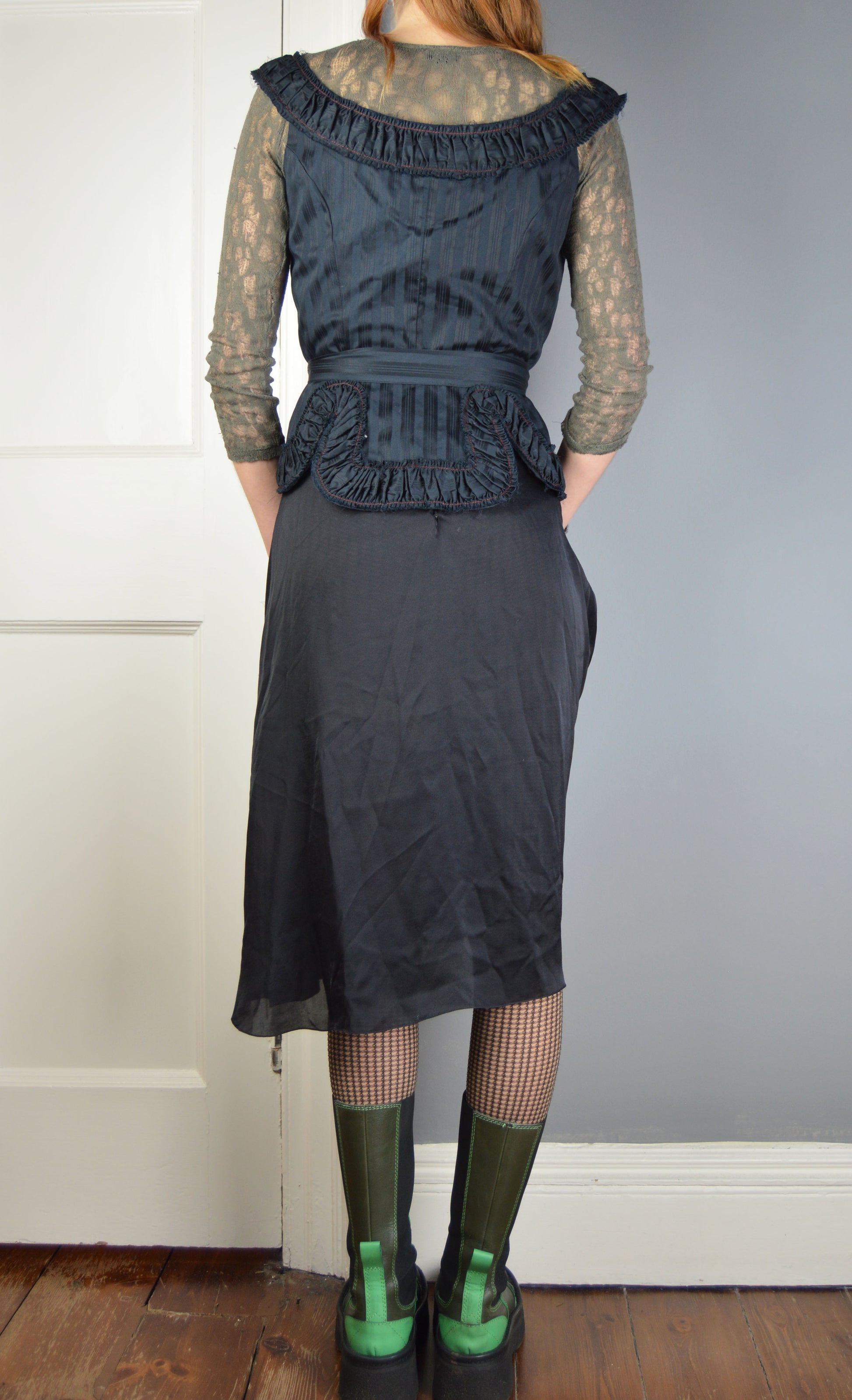 An absolutely gorgeous corset/bustier from Vivienne Westwood's Anglomania line. The size on the label is a 42 IT (10 UK) and it has been pictured here on a size 6/8 UK, 5 7". Please refer to the measurements below for more information. The item is in good condition, but please be aware that the frilling has loose threads on it, which I believe to be part of the design but please refer to the last image for a closer look.