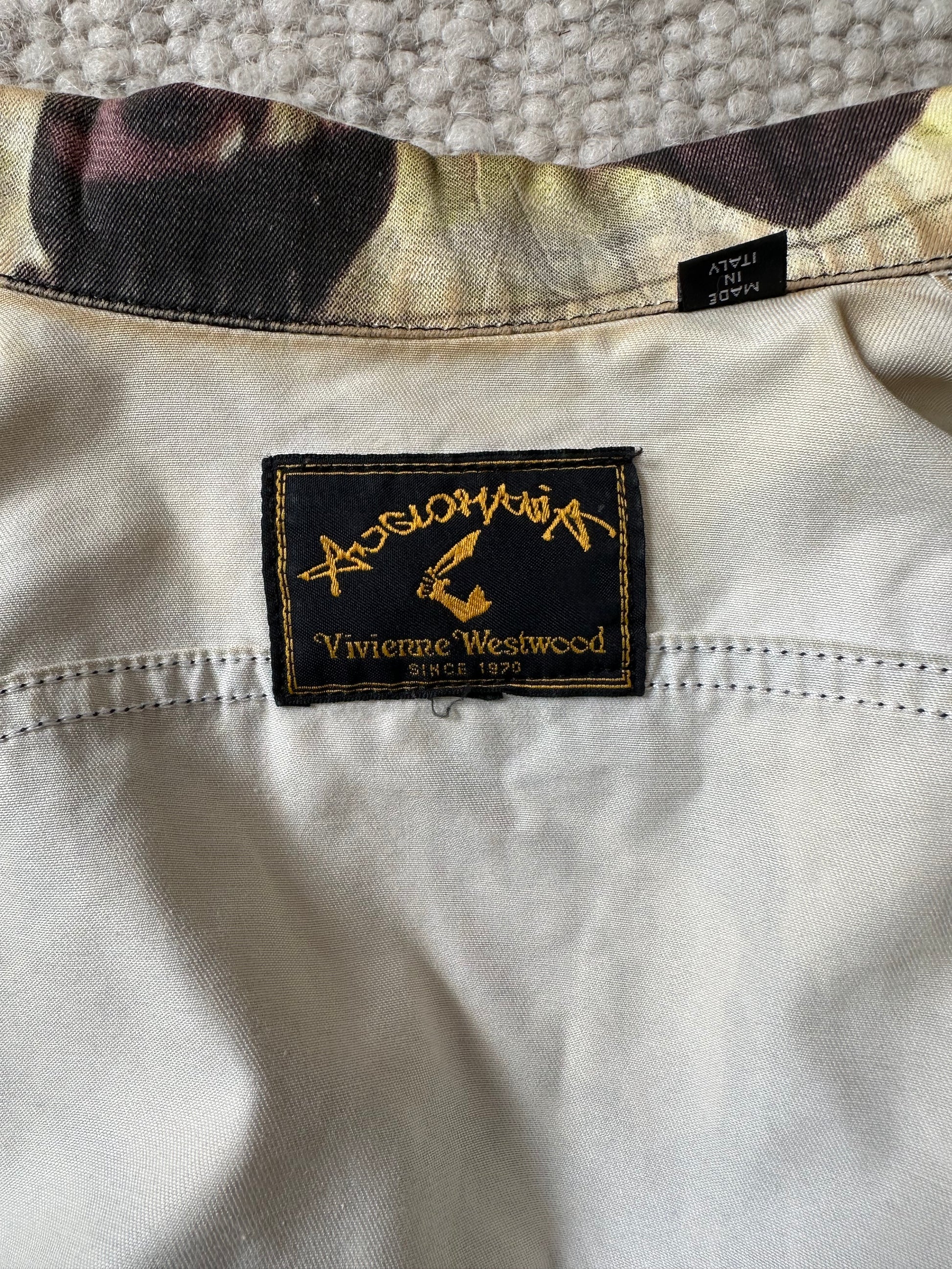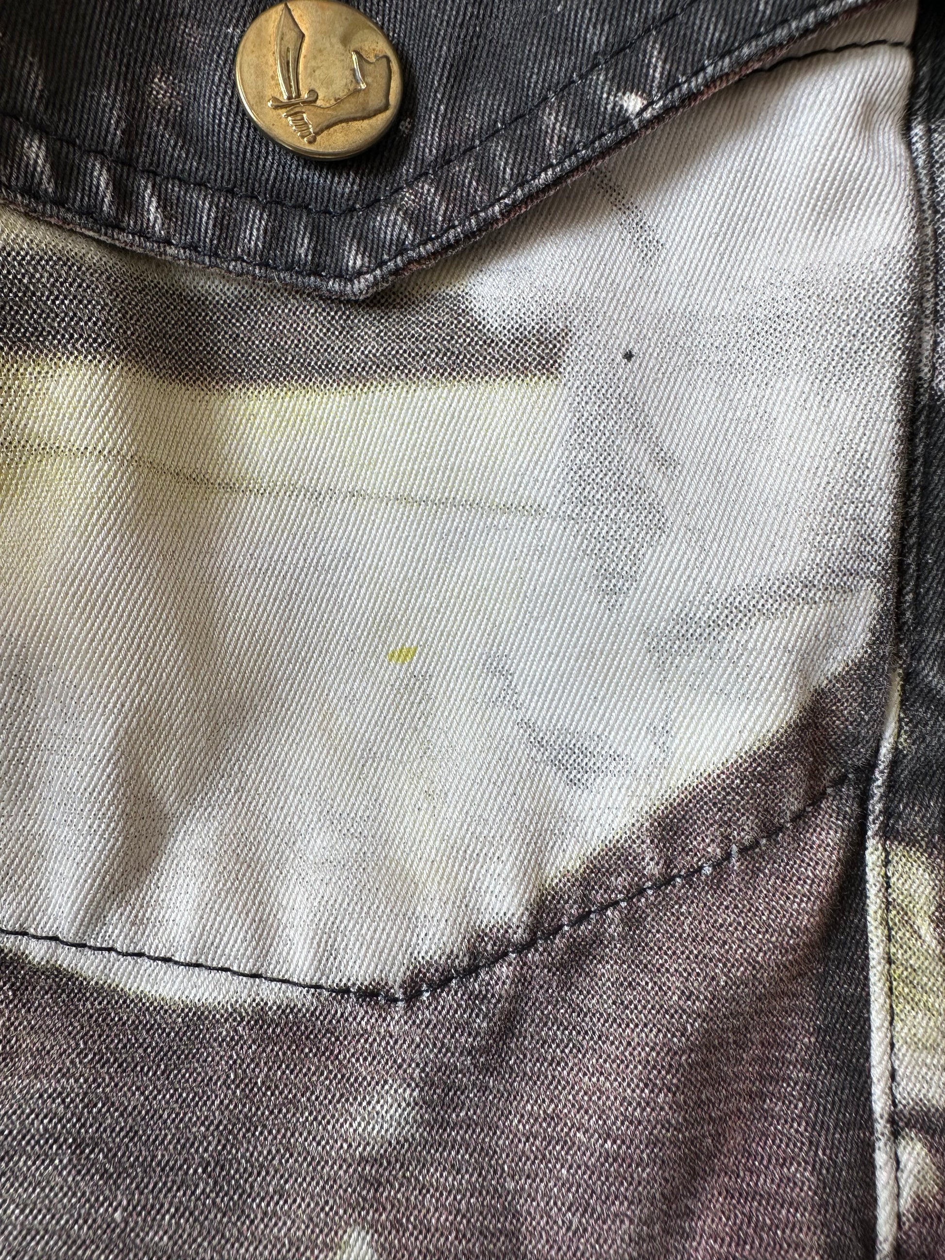 A fabulous Vivienne Westwood Anglomania S/S 1998 jacket. The jacket features a print of a photograph used in the advertising campaign. It is in good condition but there is some interior staining and a very small mark on one of the breast pockets. Otherwise there are no flaws. Pictured here on a size 40 IT, 5 7" and the size label has been removed so please refer to the measurements below for more detail.